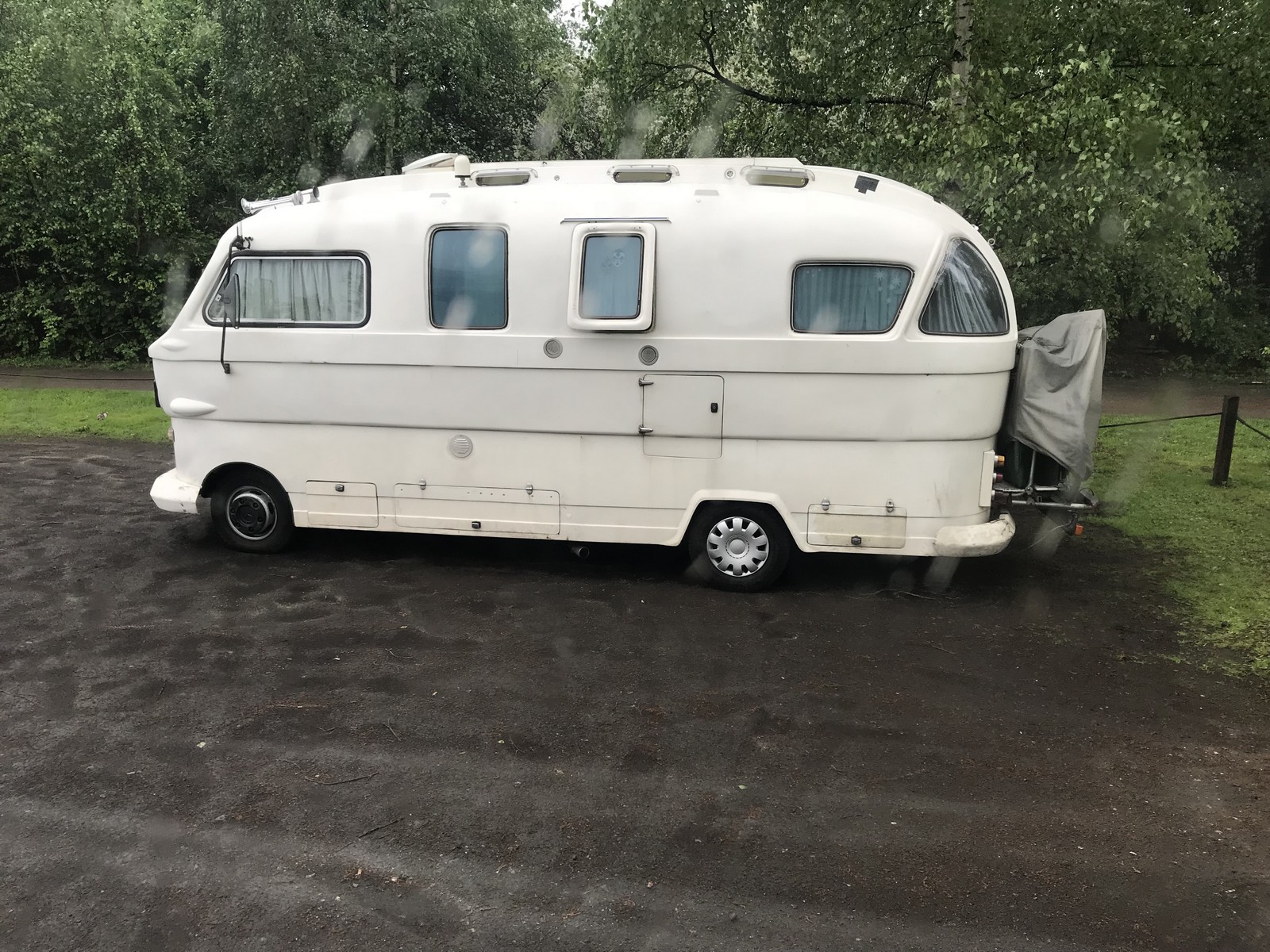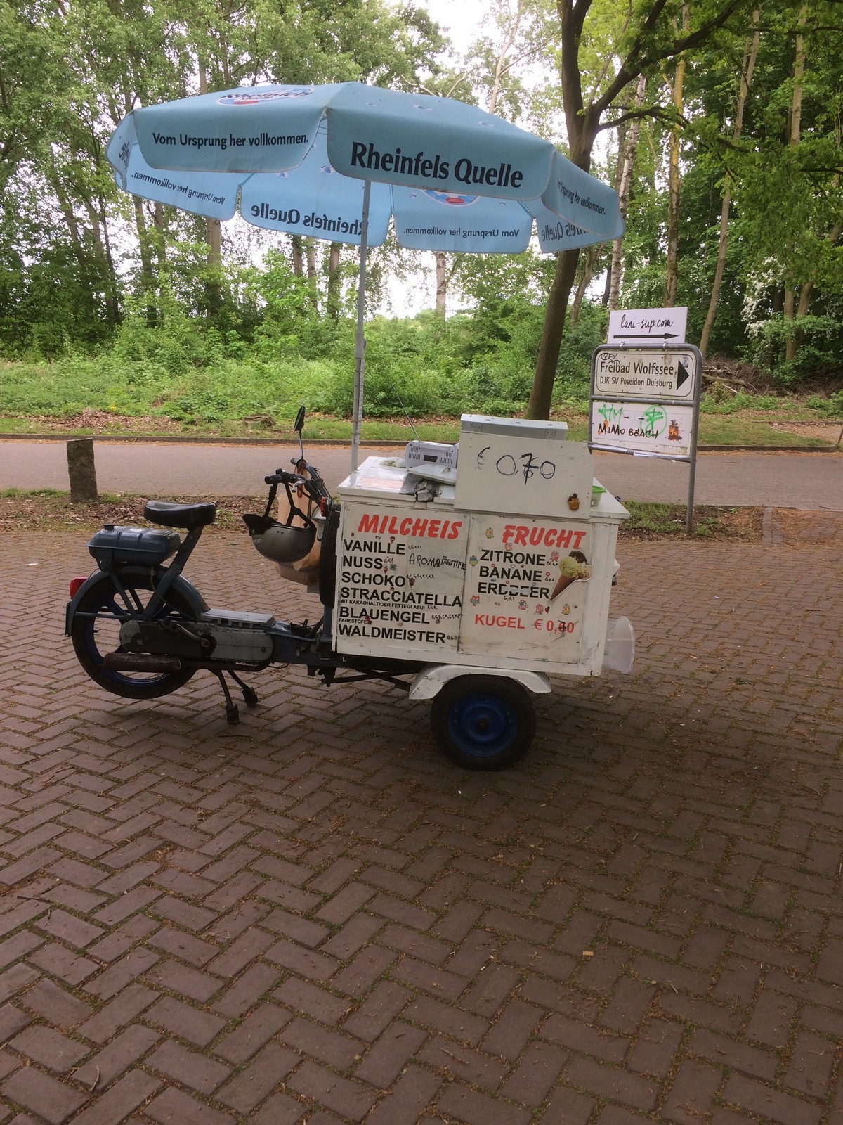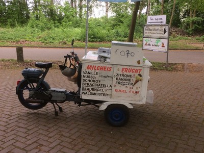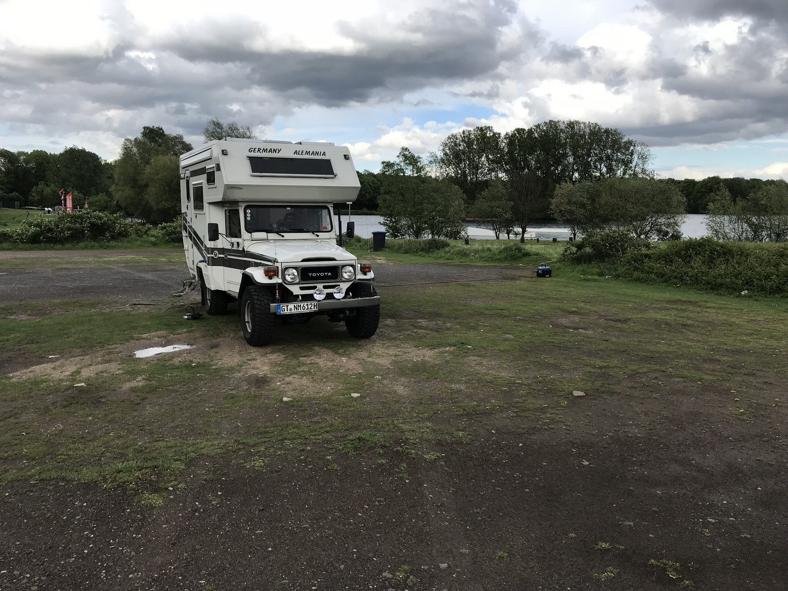 Montag, 30.4.2018:Die Nacht war unruhig. Es zog ein kräftiges Gewitter über uns und einige Mal rumste es schon ganz ordentlich. Auch der nächste Morgen empfing uns mit Regen. Da wir aber zum größten Zoogeschäft der Welt wollen, stört der Regen nicht wirklich. Hier bekommt man einen Knall. Es gibt wirklich alles. Hund, Katze, Maus, Grille, Schlange, Fisch, Huhn, Hamster, Gecko, Schildkröte, Varan, Schnecke, Krebs, Languste, Anemone, Koralle, Papagei, Vogel, ... . Nur das Futter für unsere Gourmetkatze haben sie nicht. Trotzdem gehen wir natürlich nicht mit leeren Händen. Danach fahren wir noch kurz beim Baumarkt vorbei, um die verloren gegangene Kette des linken Schmutzfängers zu ersetzen. Hier machen wir auch erstmal Pause und erholen uns von der stickigen Luft beim Zoogeschäft. Am späten Nachmittag fahren wir über Homberg nach Rheinhausen, wo mein anderer Opa gewohnt hat. Dann fahren wir wir noch zum Toeppersee, da war ich früher auch öfter. Auch in der DLRG war ich hier. An der Wasserskianlage überlegen wir kurz, ob wir hier bleiben wollen, finden die Idee aber nicht so dolle. Der Streifenwagen, der hier am A... der Welt Patrouille fährt, verheißt nichts Gutes. Also packen wir nur kurz den Möppel aus um die Batterie wieder etwas zu laden und nach einer Stunde machen wir uns auf den Weg nach Moers, auf den Stellplatz am Solimare. Da die Schranke fehlt, erübrigen sich auch die 6,50€. Hier bleiben wir für heute Nacht, auch wenn hier, wie schon den ganzen Tag, eine steife Brise weht und Manni ganz schön durchgeschüttelt wird.